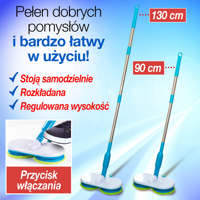 Dwie obrotowe głowice obracają się setki razy na minutę, dzięki czemu ściereczki z mikrofibry wielorazowego użytku podnoszą i zbierają brud ze wszystkich zakamarków z siłą tysiąca maleńkich szczotek. Wystarczy spryskać ściereczki ulubionym środkiem czyszczącym i pozwolić mu działać. Zobaczysz, jak mop obrotowy Duo Spinner, dzięki automatycznemu ruchowi, porusza się niemal sam, wystarczy tylko palec, aby nim kierować!