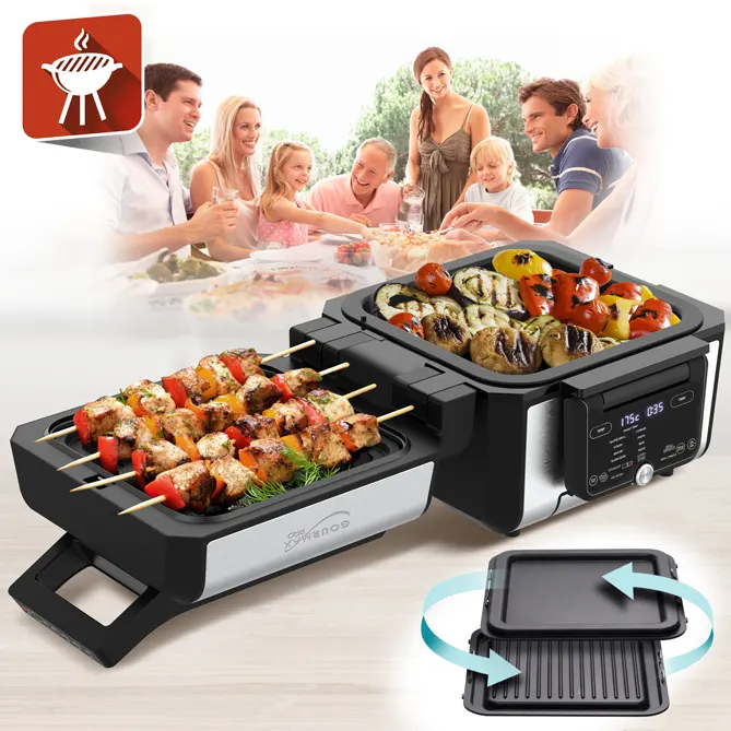 GOURMAX PRO posiada dwie odwracalne blachy do smażenia i grillowania. Możesz gotować na jednej lub na obu jednocześnie, dzięki czemu masz podwójną powierzchnię, oszczędzasz czas i nie mieszasz smaków. Są idealne do przygotowania dania głównego i dodatku. Możesz je łączyć tak jak chcesz. Wystarczy tylko je odwrócić!