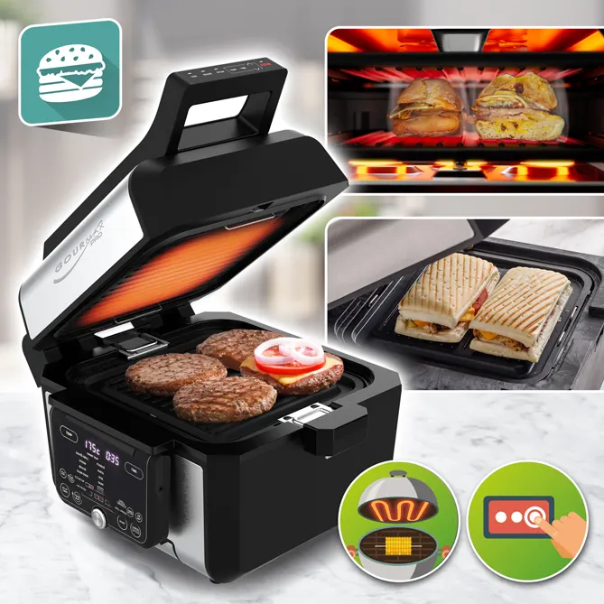 Masz dość gromadzenia urządzeń kuchennych, które służą tylko do jednej rzeczy, a potem trzeba je zmywać? Wybierz GOURMAX PRO! To jedyne urządzenie, które nadaje się do wszystkiego, ponieważ piecze, gotuje, dusi, smaży, zapieka, suszy, gotuje na parze, smaży bez oleju... Wystarczy nacisnąć przycisk, a będziesz mieć do dyspozycji płytę grzejną, grill, garnek o dużej pojemności, frytkownicę powietrzną, piekarnik, opiekacz do kanapek... Wszystko czego chcesz, do tego bez dymu i brudu, prawie bez oleju. Oszczędzasz prąd, czas i miejsce.