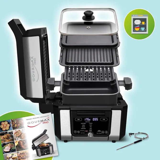 Chcesz więcej? GOURMAX PRO może również służyć jako piekarnik do pieczenia mięsa lub ryb, wypieków lub suszenia. Oszczędzisz 85% energii w porównaniu z tradycyjnymi piekarnikami i będziesz mógł kontrolować stopień wysmażenia mięsa w dowolnym momencie dzięki termometrowi z sondą. A co najważniejsze, po zakończeniu gotowania wszystkie elementy można łatwo umyć w zmywarce.