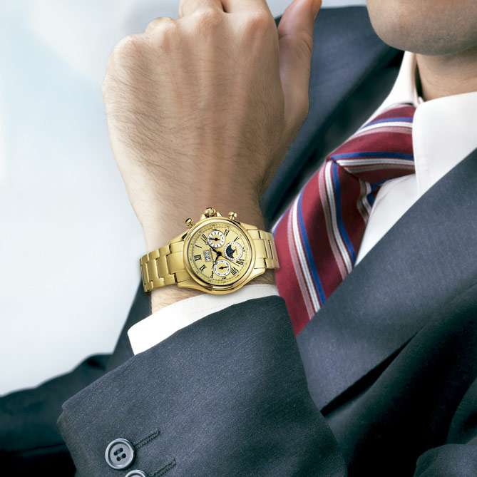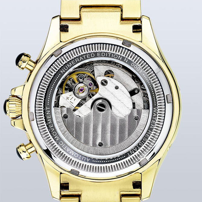 Jego wytworny design kryje w sobie precyzyjny, wielofunkcyjny mechanizm automatyczny z 21 rubinami, które minimalizują tarcie między elementami, zapewniając maksymalną dokładność i umożliwiając doskonałe działanie 5 skomplikowanych funkcji zegarka widocznych na tarczy: duże okienko kalendarza, trzy dodatkowe tarcze (dzień tygodnia, miesiąc i 24 godziny) oraz funkcja „Noc i dzień”.